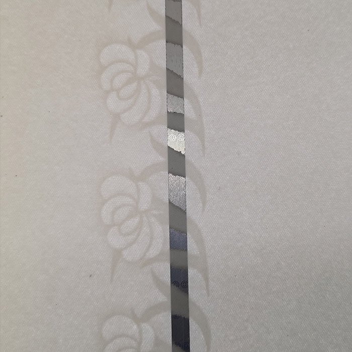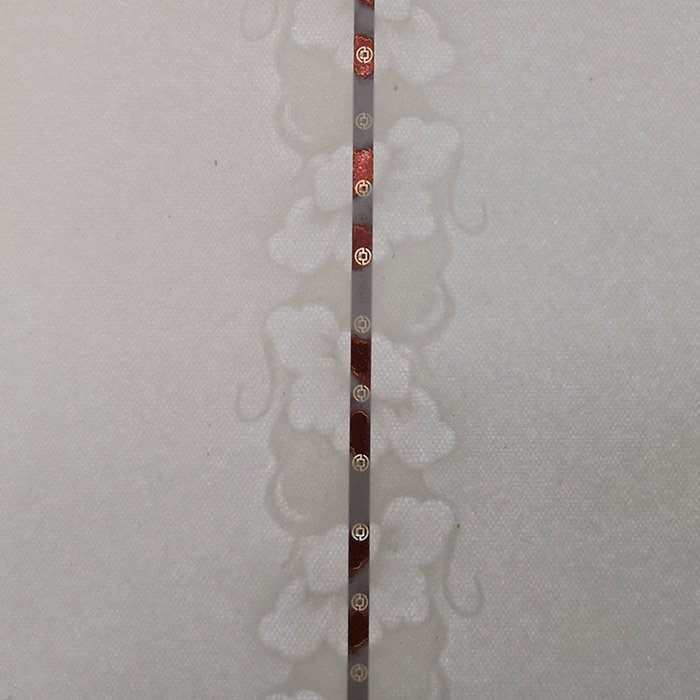在造纸的过程中(zhōng),在水印纸张的特定位置包埋入特制的金属線(xiàn)或不同颜色的聚酯类塑料線(xiàn)、缩微印刷線(xiàn)或荧光線(xiàn)。对光观察时可(kě)见到有(yǒu)一条完整的或断续(开窗)的線(xiàn)埋 藏于纸基中(zhōng)。線(xiàn)的形状一般為(wèi)直線(xiàn),也可(kě)作(zuò)成波浪型、锯齿型等。开窗式安(ān)全線(xiàn)断续的暴露于纸面,用(yòng)复印机复印时,暴露的金属線(xiàn)被复印成断续的黑線(xiàn),故不能(néng)复 制。安(ān)全線(xiàn)可(kě)设计成各种颜色,也可(kě)双色间隔的同处一条線(xiàn)上,線(xiàn)上还可(kě)有(yǒu)缩微文(wén)字。