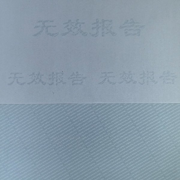•防复印检测报告纸:一般通过印刷線(xiàn)条或者点精(jīng)细图文(wén),使得复印物(wù)复印时,会对复印机造成干扰,故而显示比如“COPY”或者”VOID”等图案,也可(kě)根据需定制。光漫反射防复印纸,在纸表面用(yòng)真空蒸汽喷镀颗粒极小(xiǎo)的铝粉,再涂布,或者以覆膜的方式在纸表层黏附一层有(yǒu)着色剂及金属箔的透明膜制成,复印后一般显示全黑。