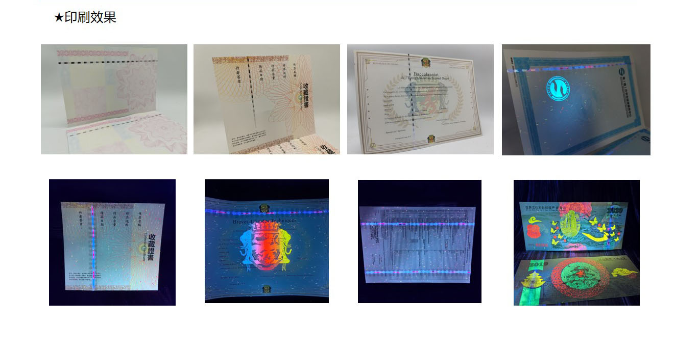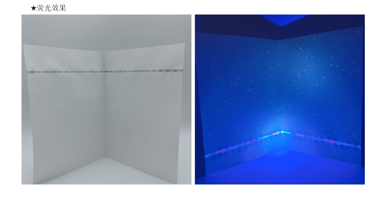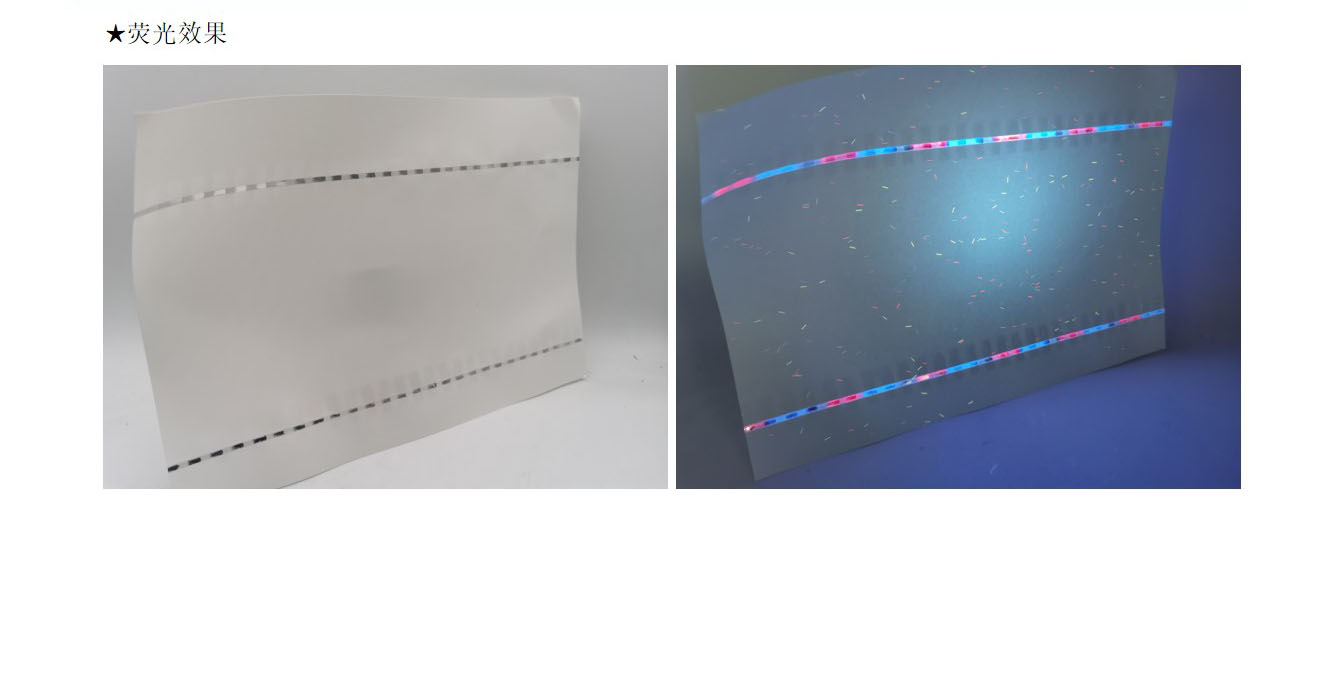纤维纸:造纸时将红蓝等有(yǒu)色纤维或彩色小(xiǎo)片(点)掺入纸浆内,或在纸张未定型前撒在纸张表面,在紫外線(xiàn)照射下有(yǒu)荧光反射,使纸中(zhōng)带有(yǒu)區(qū)别于纸张本身的有(yǒu)色纤维。掺入纸浆中(zhōng)的红蓝纤维丝和彩点有(yǒu)彩色纤维与无色荧光纤维两种。