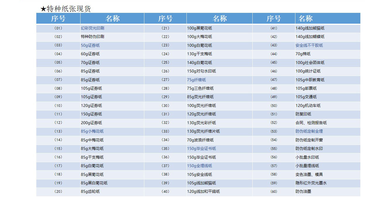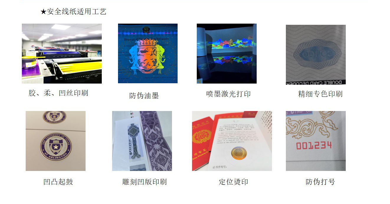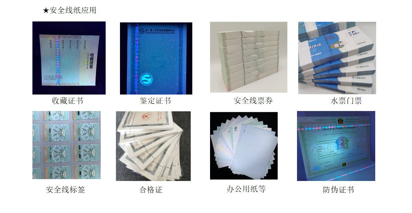 安(ān)全線(xiàn)纸:指造纸过程中(zhōng)将一条金線(xiàn)或塑胶線(xiàn)置于纸张中(zhōng)间。起初使用(yòng)的是特制金属線(xiàn),现在使用(yòng)聚酯类塑胶線(xiàn)、微型字母安(ān)全線(xiàn)、荧光安(ān)全線(xiàn)、磁性線(xiàn)等。