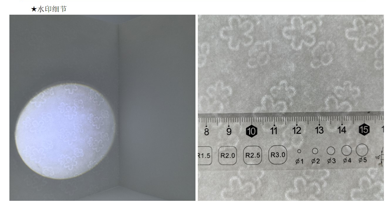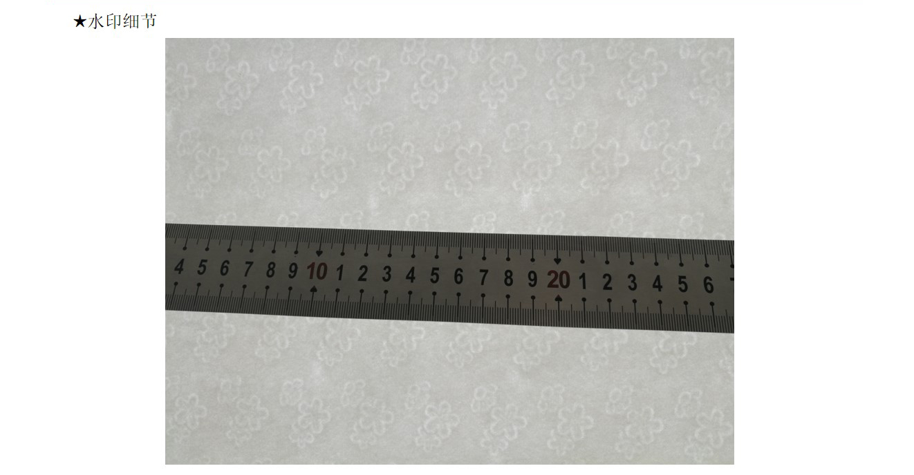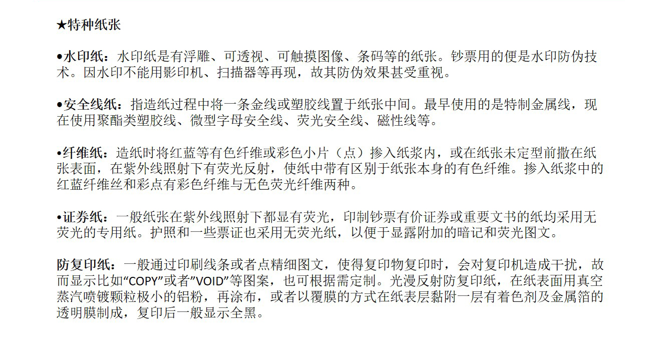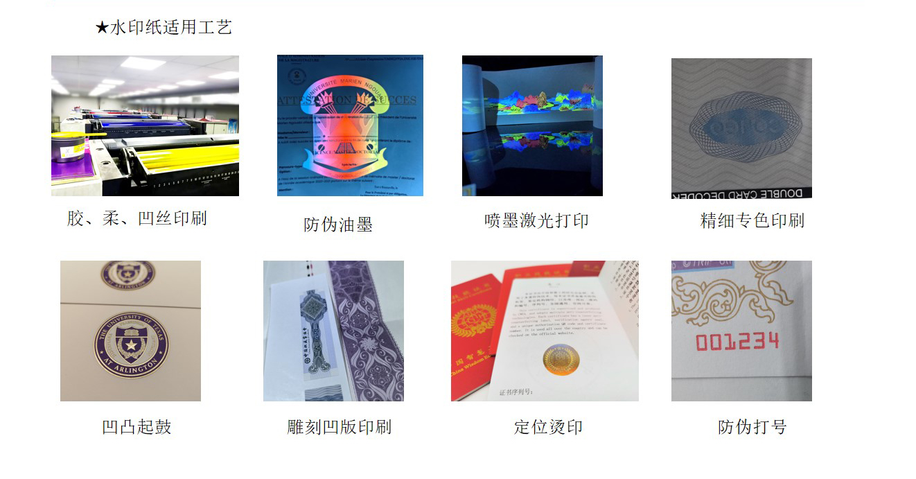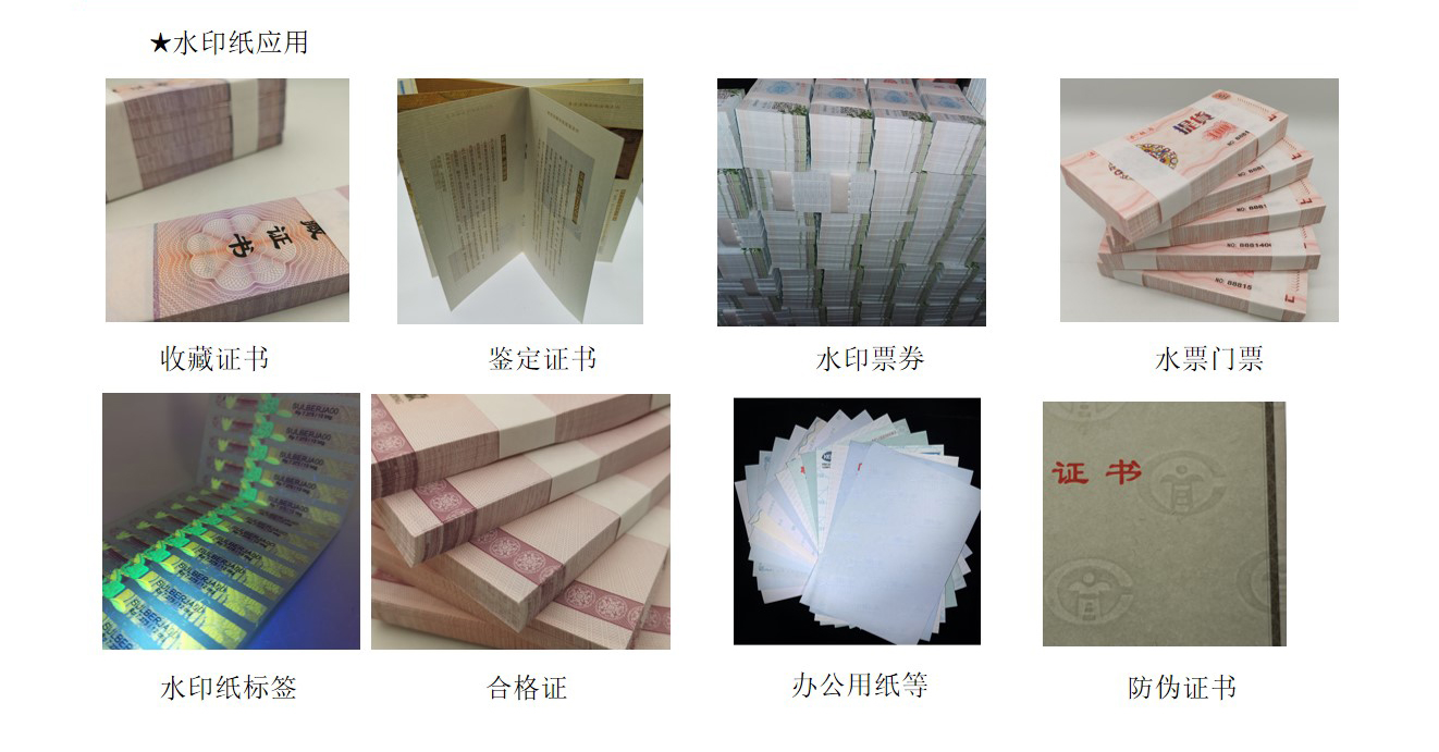 水印纸:水印纸是有(yǒu)浮雕、可(kě)触摸图像、条码等的纸张。钞票用(yòng)的便是水印防伪技(jì )术。因水印不能(néng)用(yòng)影印机、扫描器等再现,故其防伪效果甚受重视。
