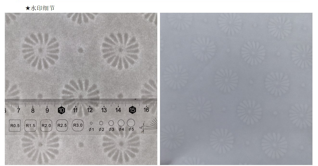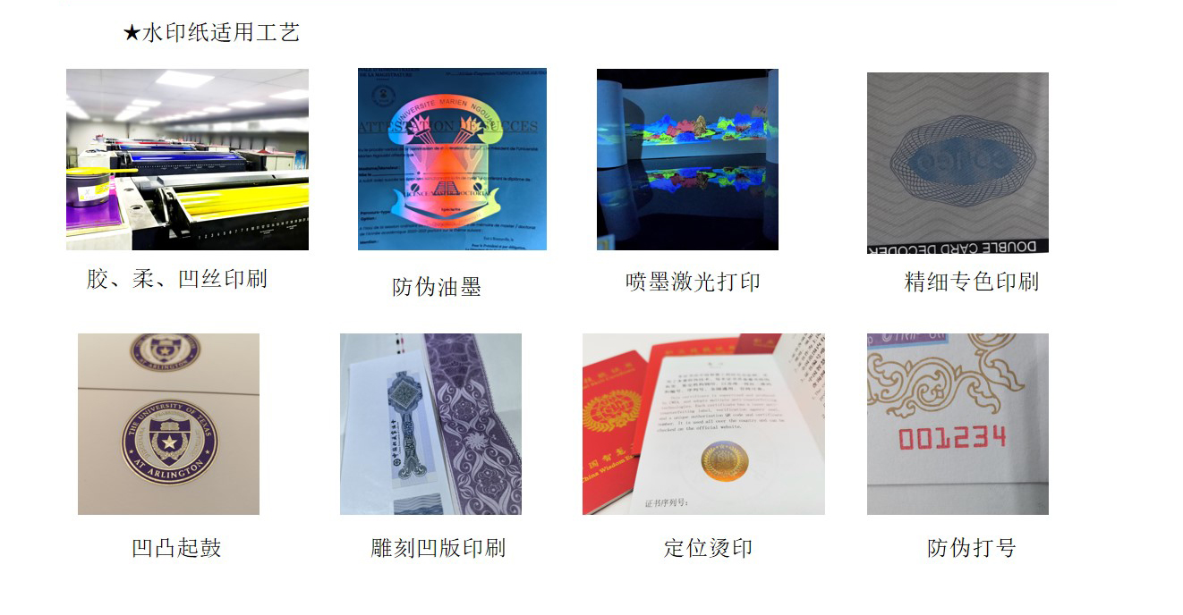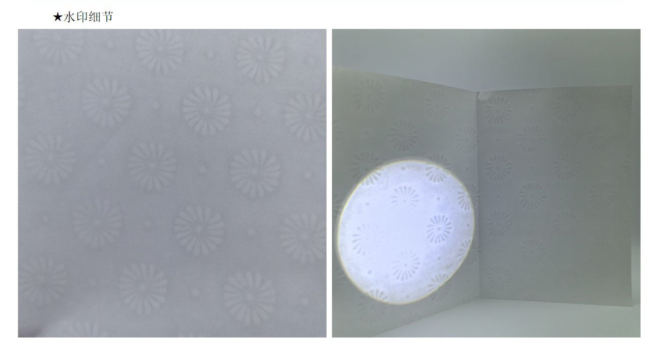 水印纸是有(yǒu)浮雕、可(kě)触摸图像、条码等的纸张。钞票用(yòng)的便是水印防伪技(jì )术。因水印不能(néng)用(yòng)影印机、扫描器等再现,故其防伪效果甚受重视。